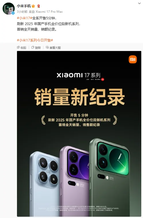 9月27日上午10点,小米17系列正式开售。据小米手机官方微博消息,小米17全系开售5分钟,刷新了2025年国产手机全价位段新机系列首销全天销量、销额纪录。