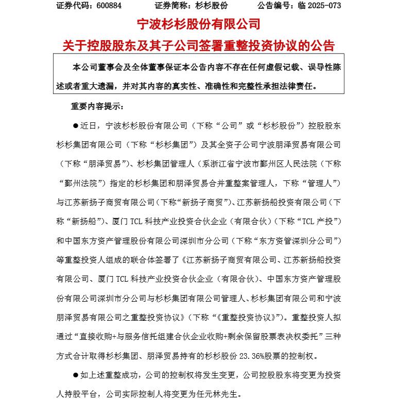 杉杉股份称,本次重整投资协议签署后,相关重整计划(草案)尚需提交债权人会议表决,完成经营者集中申报,以及相关法院裁定批准。