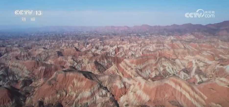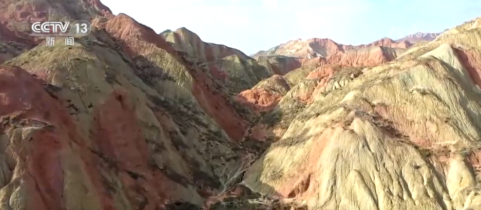 通过航拍画面可以看到,记者身后的景色就像一幅徐徐展开的水墨画——红、黄、青、灰等色彩交叠在一起。景区工作人员告诉我,这“水墨感”的秘密藏在山体里:足足有三十多种矿物质,阳光一照,就会呈现出不同的色彩,这也是“水墨丹霞”名字的由来。