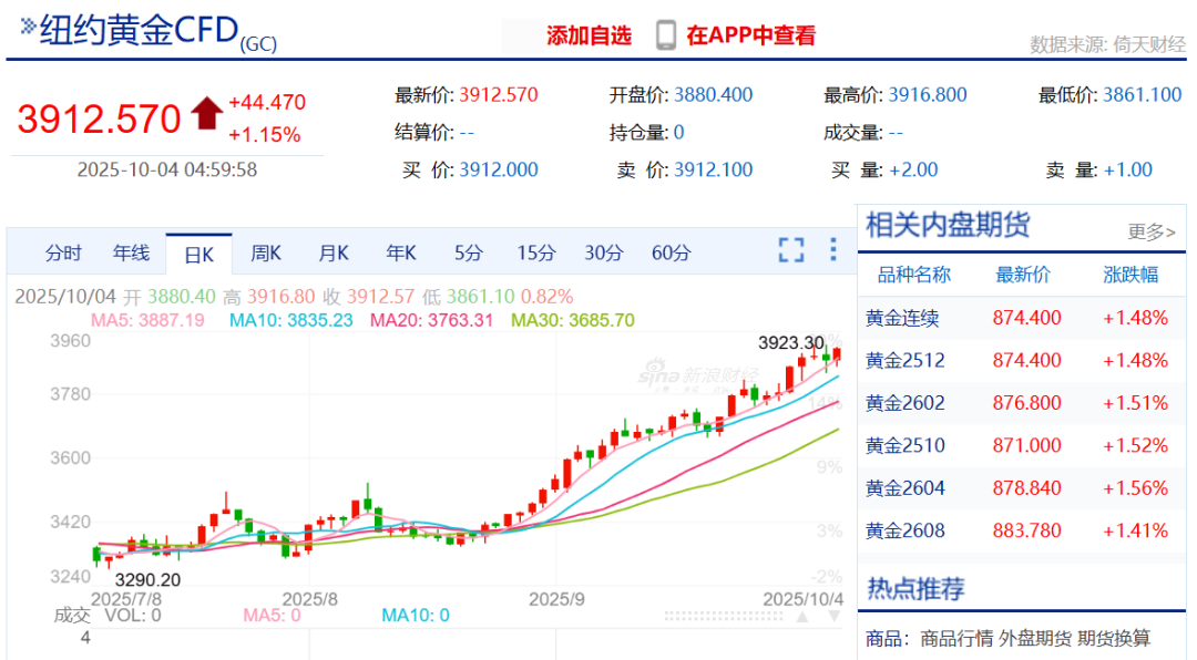 10月4日,COMEX黄金期货收涨1.14%,报3912.1美元/盎司,本周累计上涨3.23%,年内已涨超48%。现货黄金报收3886.47美元/盎司,年内也已涨超48%。