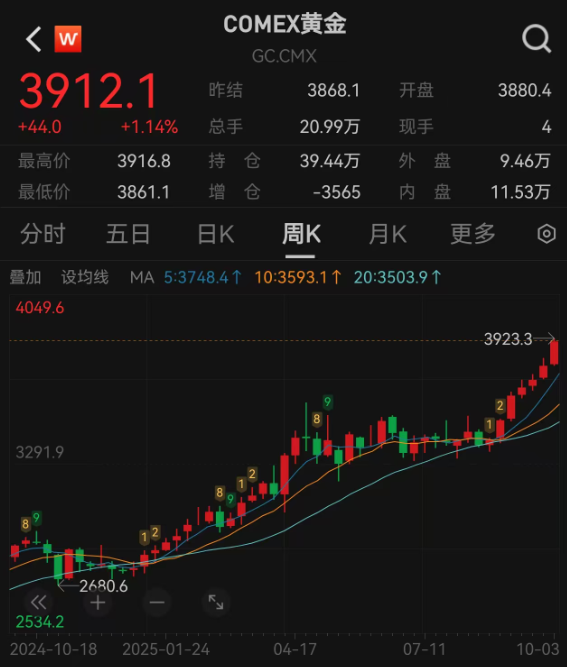 央广网北京10月5日消息(记者冀文超)金价本周再创新高。Wind数据显示,截至发稿,COMEX黄金期货价格报3912.1美元/盎司,当日上涨1.14%;本周触及3923.3美元/盎司,创历史新高,本周累计上涨3.23%。
