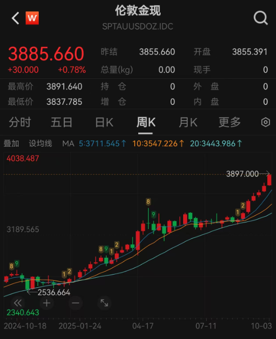 截至发稿,现货黄金(伦敦金现)报3885.66美元/盎司,日内涨0.78%,本周触及3897美元/盎司,创历史新高。