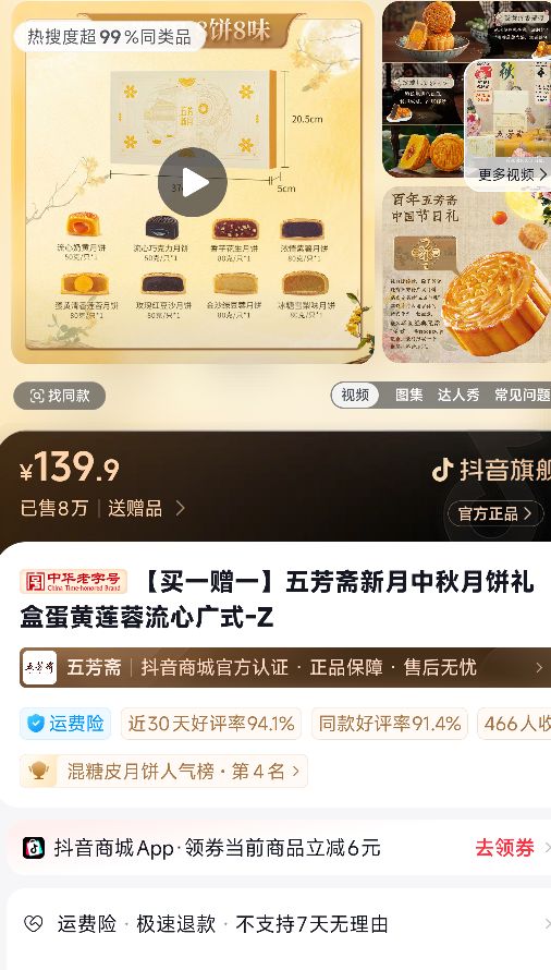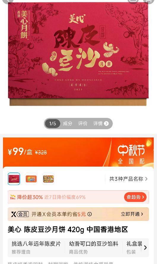 值得一提的是,线上渠道的月饼价格也出现不同程度下调。例如,盒马超市销售的美心月饼陈皮豆沙礼盒,APP价格趋势显示从10月5日的328元降至10月6日的99元,降幅约69.82%。同时,五芳斋旗舰店一款139.9元的蛋黄莲蓉流心月饼礼盒推出“买一送一”活动。记者注意到,这些促销活动早在中秋假期前就已启动。