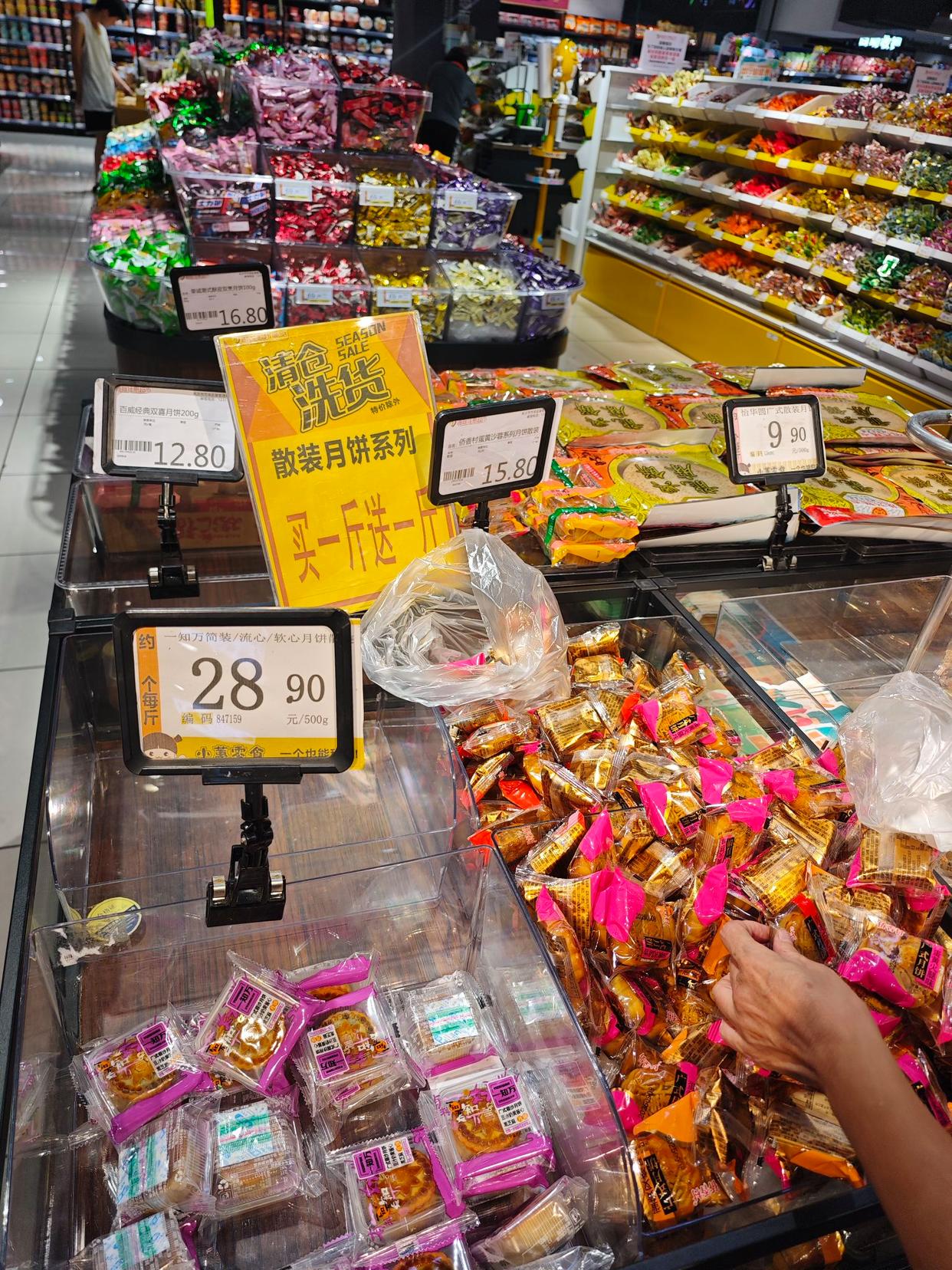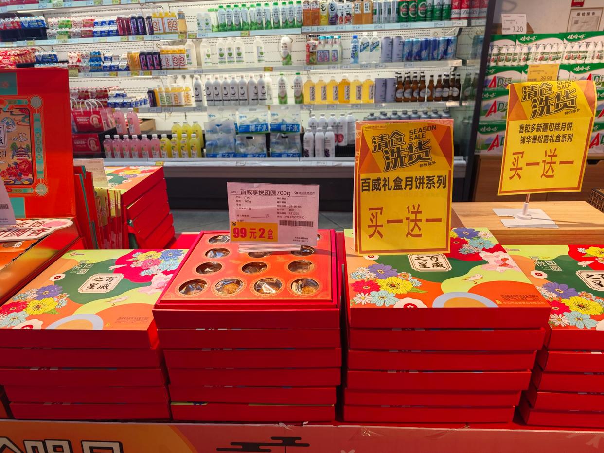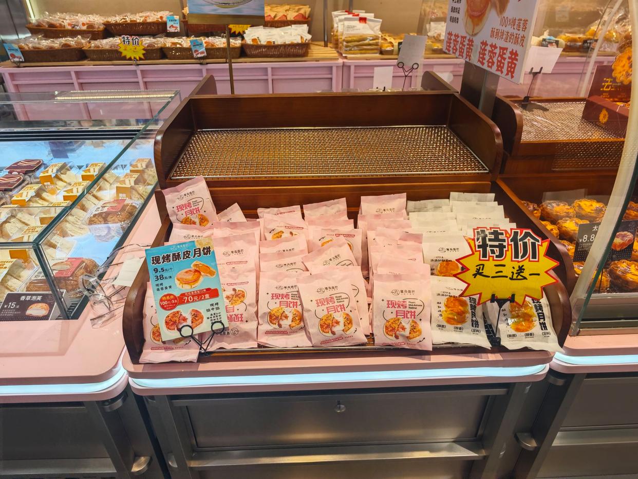 在通程佳惠超市,烘焙区店员正销售最后一批现烤月饼,虽未设置促销牌,但在记者询问后表示:“现在购买现烤月饼可享‘买四送一’,或赠送面包。”,散装月饼区则打出“清仓洗货,买一斤送一斤”的标语。