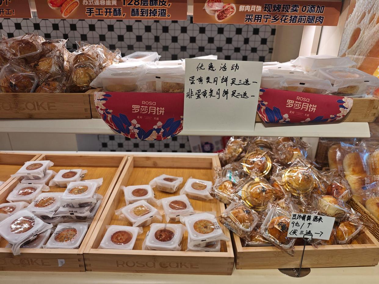 “给我拿几个散装月饼,今天还有什么优惠吗?”正在挑选月饼的市民陈小姐询问道。不远处的罗莎蛋糕门店虽未对礼盒进行特价促销,但近两天推出了蛋黄类月饼“买三送一”、非蛋黄类月饼“买二送一”的优惠。此外,店内现烤鲜肉月饼售价6元/个,同样参与“买二送一”活动。
