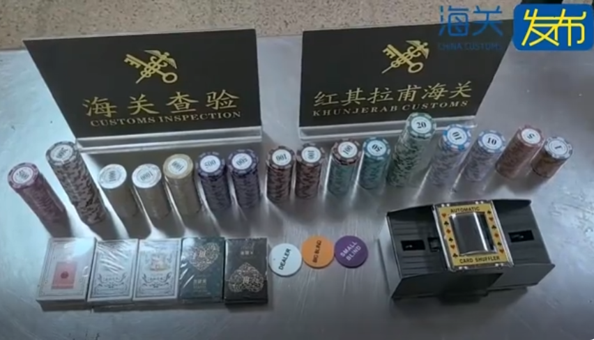 近日,乌鲁木齐海关所属红其拉甫海关在出境旅客行李中查获一批赌博用具。经现场查验关员清点,内有赌博筹码476枚——标注面值合计35.2万元;发牌器、扑克牌等赌博用具,其中两副扑克牌为疑似色情扑克牌,均属于禁止出境物品。目前海关已依据规定对以上物品进行后续处理。