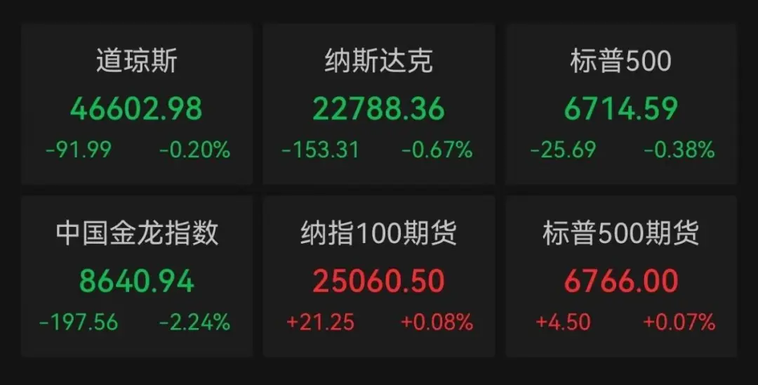 这一消息拖累三大指数集体收跌。截至收盘,标普500指数下跌0.38%,报收于6714.59点;纳斯达克综合指数下跌0.67%,报收于22788.36点;道琼斯工业平均指数下跌0.2%,报收于46602.98点。