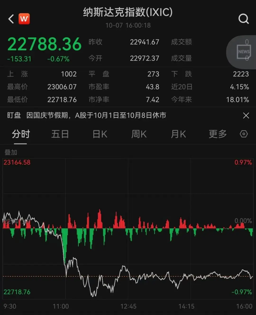 美东10月7日(周二),美股三大指数开盘后不久,开始快速下跌。
