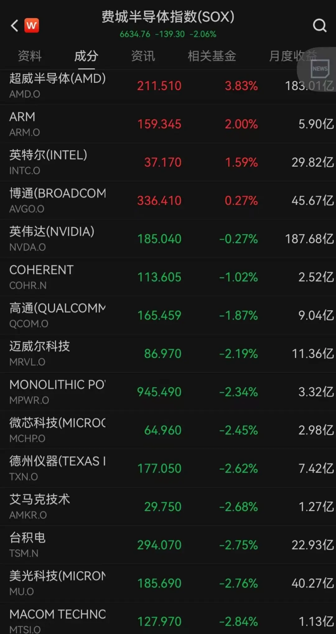 费城半导体指数跌超2%。成份股多数下跌,美光科技、台积电、微芯科技等跌超2%。