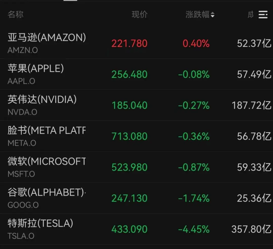 美股科技股受挫,科技七巨头普跌。英伟达下跌0.27%,微软下跌0.87%,谷歌下跌1.74%。
