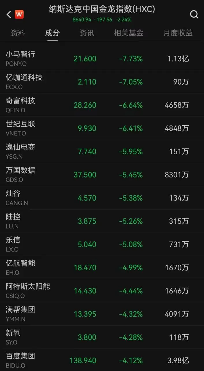 受美股大盘影响,纳斯达克中国金龙指数下跌2.24%。小马智行收跌7.73%,奇富科技收跌6.64%,世纪互联、逸仙电商、万国数据等跌幅靠前。