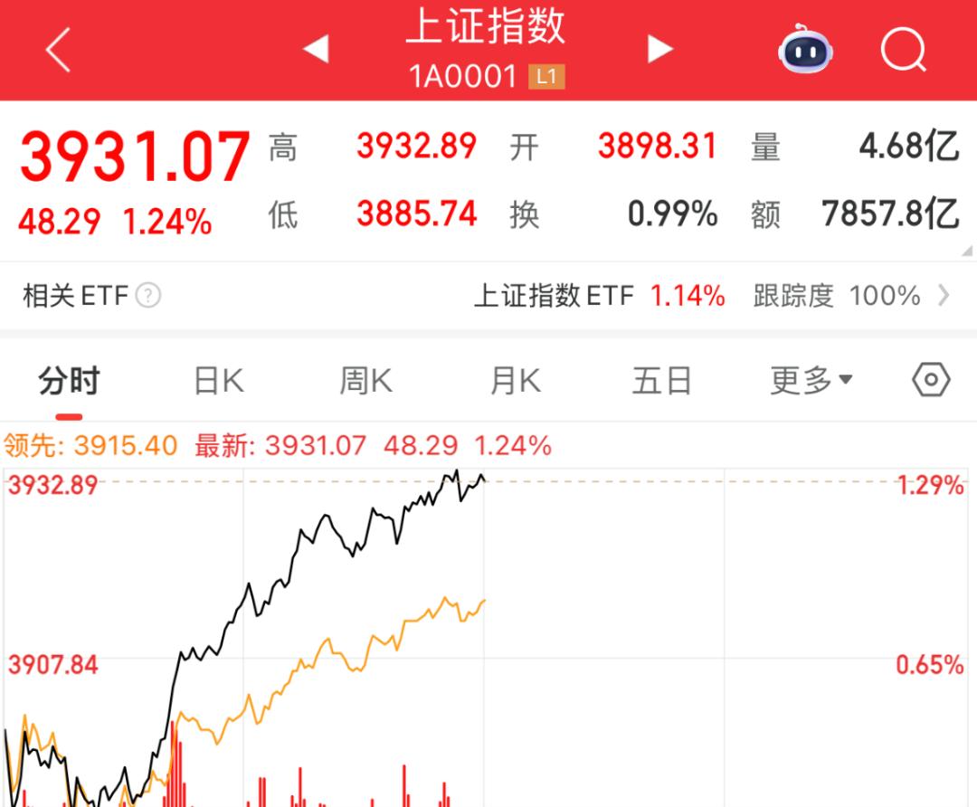 截至上午收盘,上证指数涨逾1%突破3900点,续创10年新高,自4月7日低点已涨超28%,年内累计涨幅超16%。沪深两市半日成交额1.72万亿,较上个交易日放量3547亿。