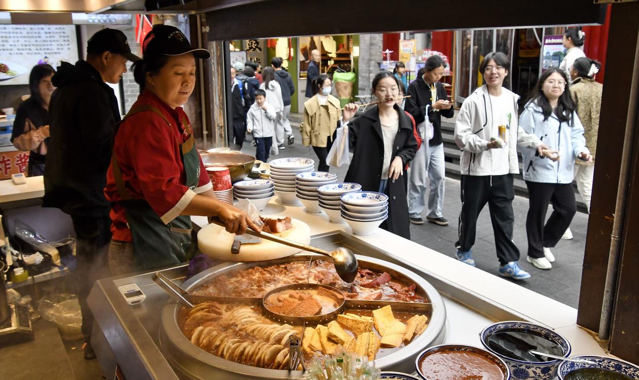 10月6日,游客在北京烟袋斜街品尝美食。新华社记者 李欣 摄 普洱云璟国际花园酒店副总经理卢瑶表示,国庆假期,美团旅行带来的异地游客环比增长近35%,其中“00后”年轻客源占比上涨近65%。