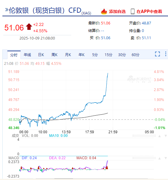 现货白银价格加速上涨,历史首次突破50美元/盎司,今年已累计上涨73%。截至发稿,涨幅扩大至4.55%,报51.06美元/盎司,继续刷新纪录新高。