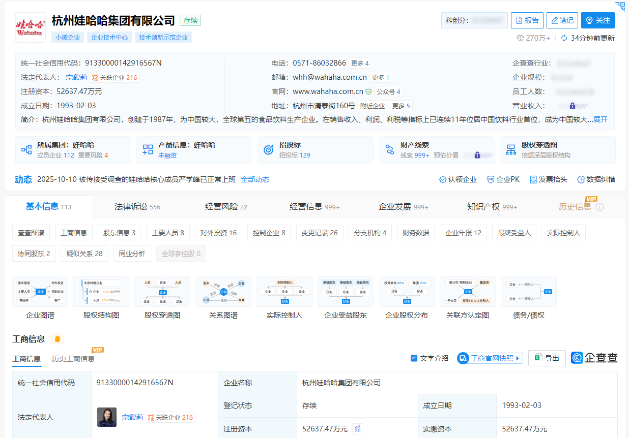 随后,记者通过企查查平台查询发现,截至发稿前,显示杭州娃哈哈集团有限公司法定代表人仍为宗馥莉。