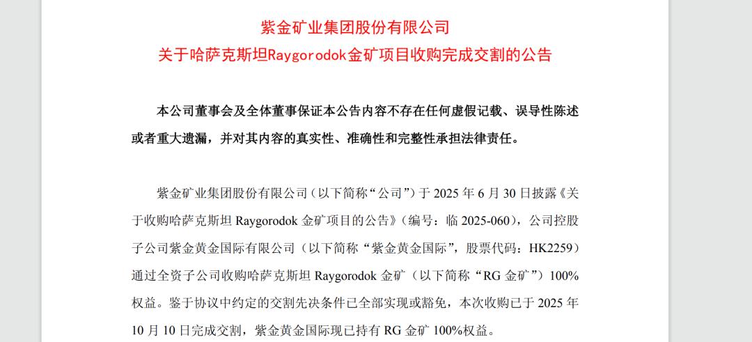 10月12日,紫金矿业公告,此前公司已披露,其控股子公司紫金黄金国际通过全资子公司收购哈萨克斯坦Raygorodok金矿(下称“RG金矿”)100%权益。
