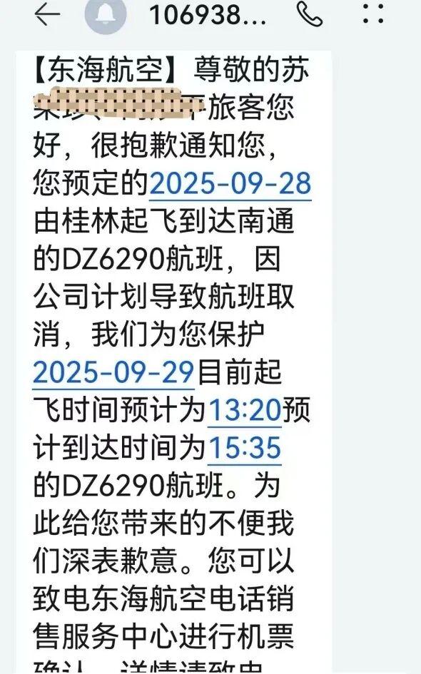 很快,保女士的家人也收到了东海航空发来的信息:您预定的2025年9月28日由桂林起飞到达南通的DZ6290航班,因公司计划导致航班取消,我们为您保护2025年9月29日目前起飞时间预计为13:20、预计到达时间为15:35的DZ6290航班……