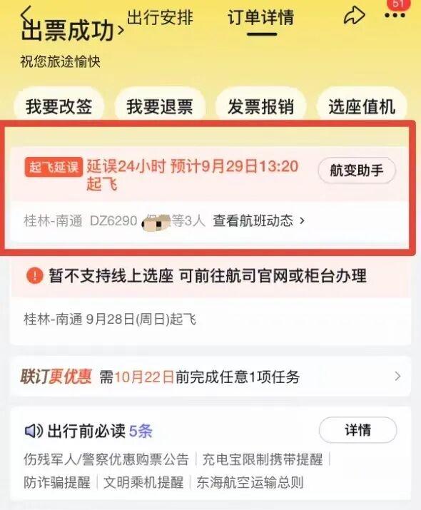 保女士称,她于9月2日为父亲、母亲和奶奶三位老人购买了东海航空9月28日13:20由广西桂林飞往江苏南通的DZ6290航班。9月22日,家人收到购票平台通知:飞机延误24小时,预计9月29日13:20起飞。