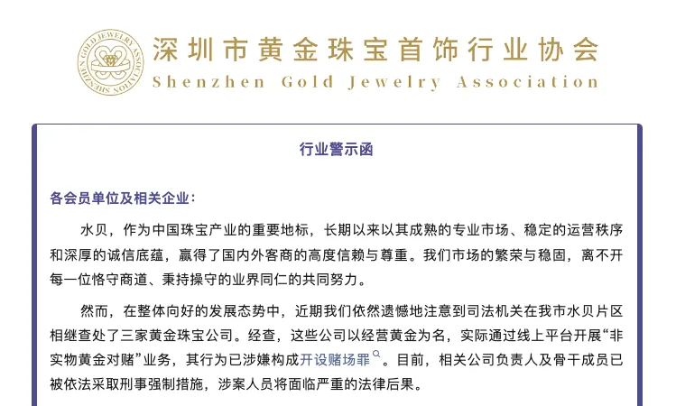 警示函称,“近期我们依然遗憾地注意到司法机关在深圳水贝片区相继查处了三家黄金珠宝公司。经查,这些公司以经营黄金为名,实际通过线上平台开展‘非实物黄金对赌’业务,其行为已涉嫌构成开设赌场罪。目前,相关公司负责人及骨干成员已被依法采取刑事强制措施,涉案人员将面临严重的法律后果。这些案件暴露出,个别企业为牟取非法利益,打着实物黄金交易的幌子,诱导客户进行高杠杆的‘买涨买跌’对赌交易,其业务实质已完全脱离黄金珠宝行业的正常经营范围,严重扰乱市场秩序,玷污行业声誉”。