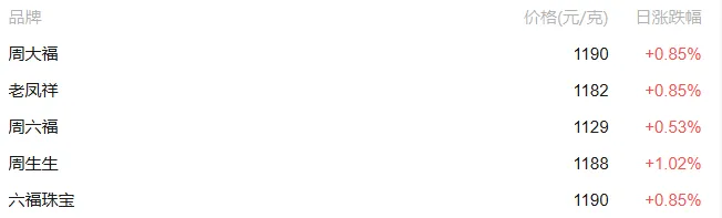 记者查询国内金饰价格,周生生今日金饰价格1188元/克,昨日价格1176元/克,上涨12元/克;老庙黄金今日金饰价格1189元/克,昨日价格1183元/克,上涨6元/克。周大福足金金饰克价1190元,老凤祥足金金饰克价1188元,老凤祥足金金饰克价1182元。