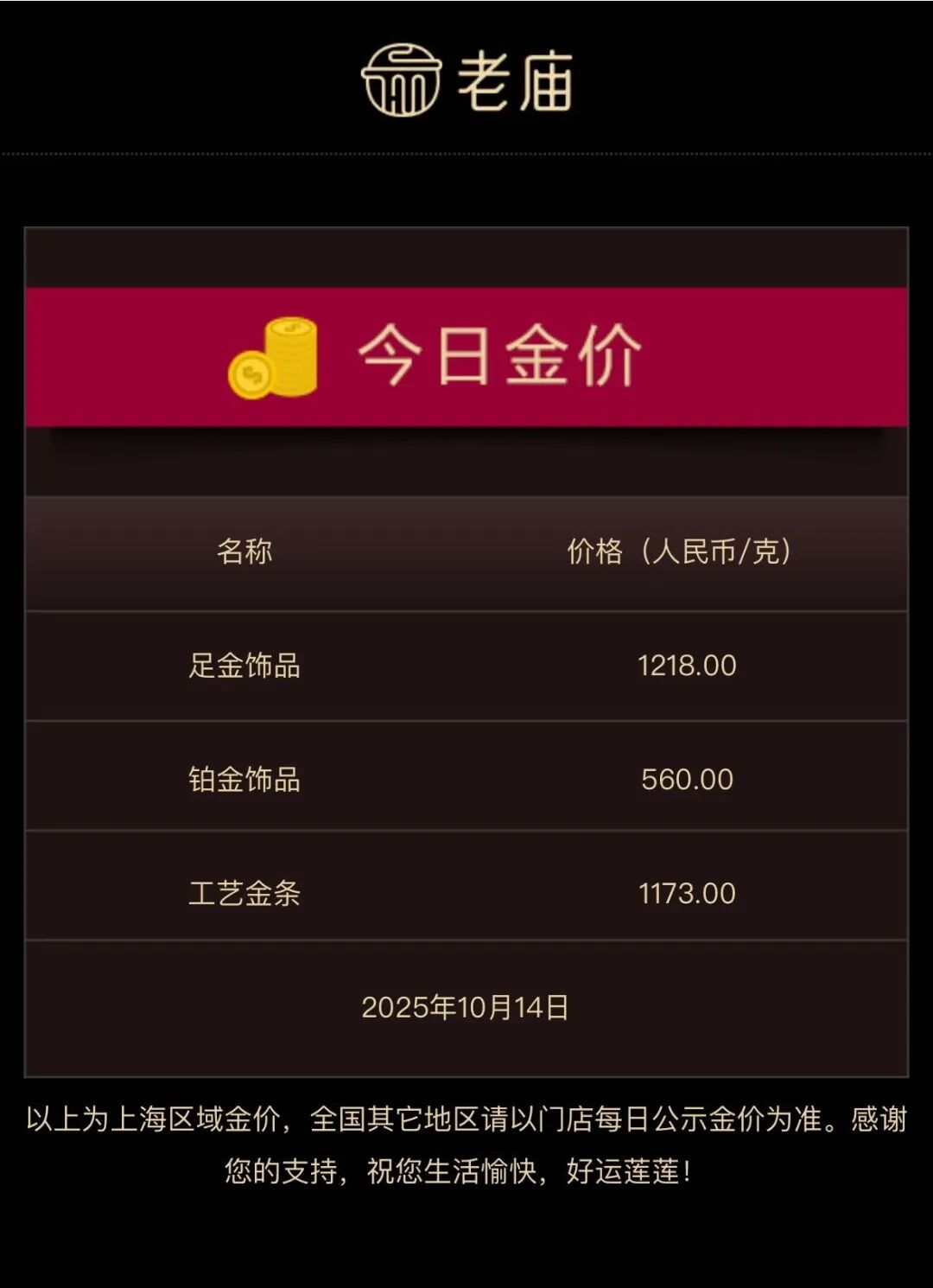 今日(10月14日)国内黄金饰品价格对比显示,国内部分黄金珠宝品牌公布的境内足金首饰价格突破1200元/克,其中老凤祥足金饰品价格为1206元/克、周生生足金饰品价格为1213元/克、老庙足金饰品价格为1218元/克。其余多数品牌金饰价格维持在1190元/克不变。