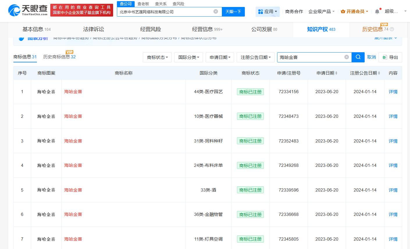 值得注意的是,李亚鹏名下的北京中书艺莲网络科技有限公司曾于2023年申请注册多枚“海哈金喜”商标,国际分类包括医疗园艺、医疗器械、饲料种籽等,目前上述商标均已成功注册。