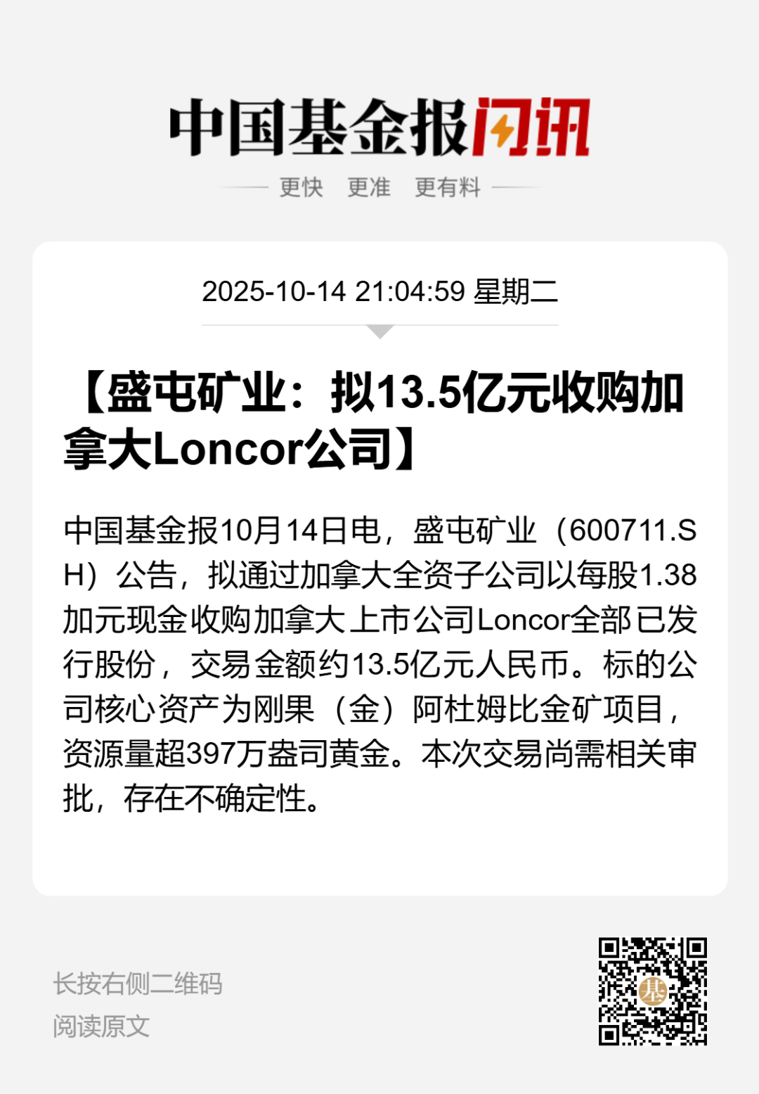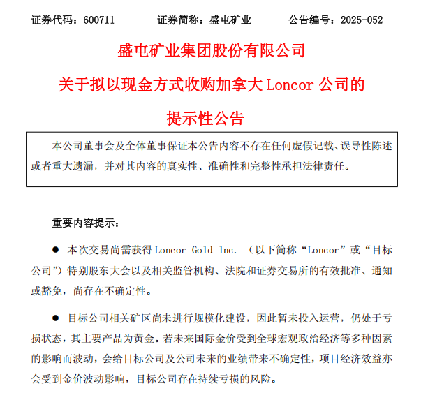 10月14日晚间,盛屯矿业发布公告称,公司拟收购加拿大上市公司Loncor Gold lnc.(以下简称Loncor)现有全部已发行且流通的普通股及待稀释股份,交易金额约为2.61亿加元,约合13.5亿元人民币。
