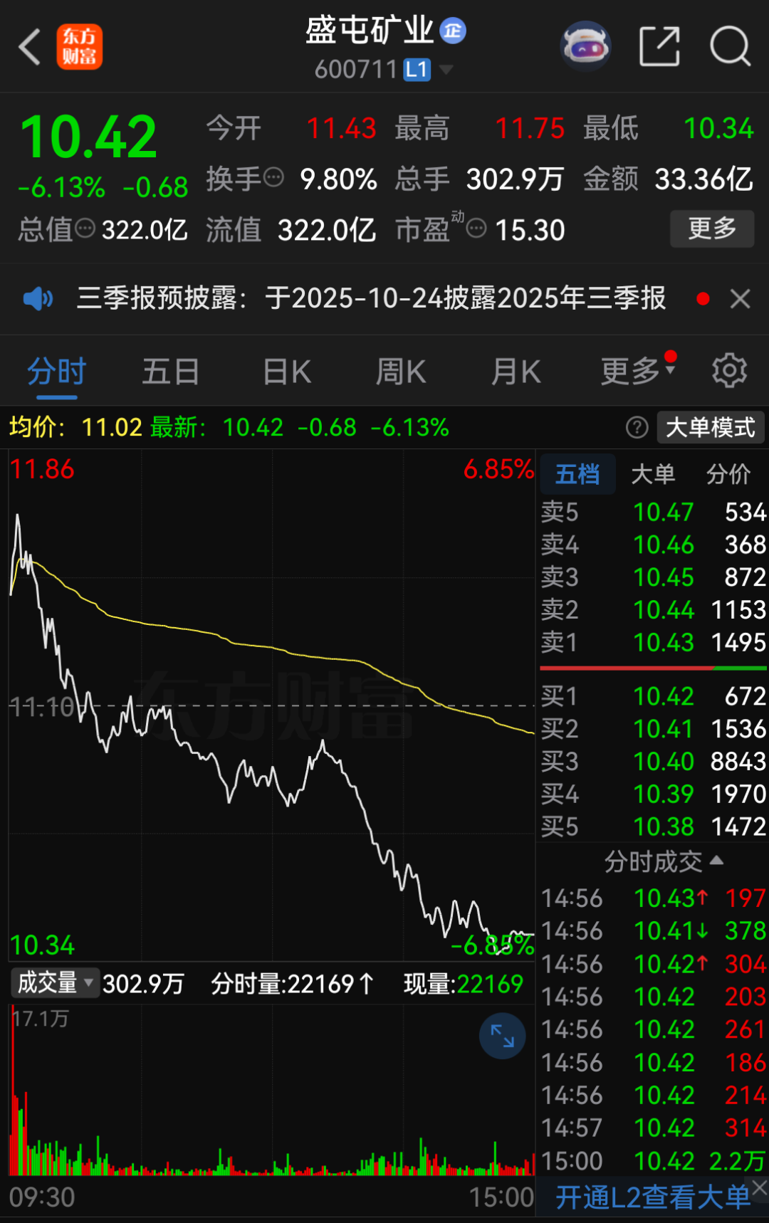 截至10月14日收盘,盛屯矿业股价报10.42元/股,跌幅达6.13%,总市值为322亿元。