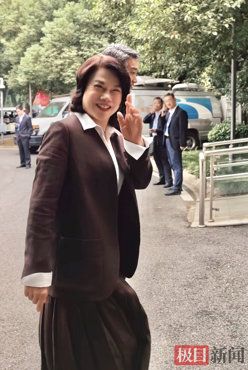 上午8时52分,极目新闻记者在武汉东湖国际会议中心长江厅外,遇见了来参加活动的格力电器董事长董明珠。只见她身穿一套深棕色西装长裙,听到记者打招呼,她非常高兴地予以回应,随后快步步入会场。在开幕式上,她作为5位发言嘉宾之一将进行发言。