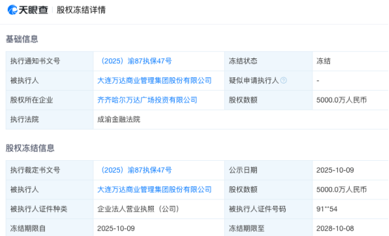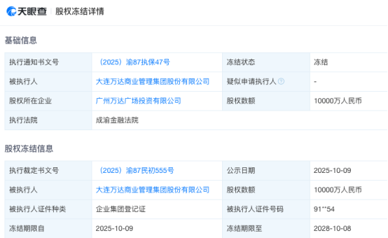 红星资本局10月15日消息,据天眼查披露信息显示,10月9日,大连万达商业管理集团股份有限公司(以下简称“大连万达商管集团”)新增两则股权冻结信息,股权所在企业分别为广州万达广场投资有限公司、齐齐哈尔万达广场投资有限公司,冻结股权数额分别为1亿元、5000万元,合计1.5亿元,冻结期限自2025年10月9日至2028年10月8日,执行法院均为成渝金融法院。