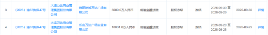 值得注意的是,就在9月29日及30日,天眼查信息还显示,大连万达商集团新增两则股权冻结信息,股权所在企业分别为乐山万达广场实业有限公司、绵阳涪城万达广场有限公司,冻结股权数额分别为约1.88亿元、5000万元,合计2.38亿元,冻结期限均为三年,执行法院均为成渝金融法院。