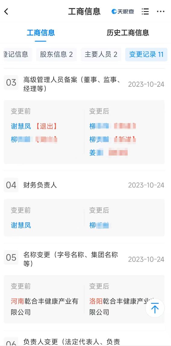 然而,2023年10月24日,乾合丰公司的法定代表人等信息又被变更,这次公司名字也由“河南乾合丰健康产业有限公司”变更为“洛阳乾合丰健康产业有限公司”。