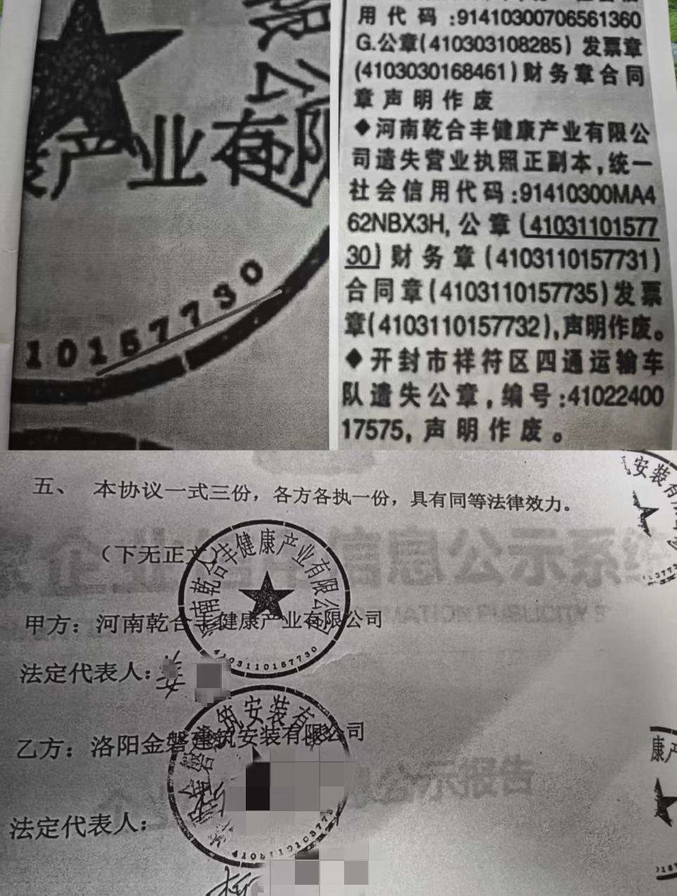 在重审一审判决书中,法院还查实,2020年4月16日,谢慧凤以乾合丰公司名义在《东方今报》进行公告,称乾合丰公司遗失营业执照正副本、公章(编号为4103110157730)、财务章、合同章、发票章,并声明作废。