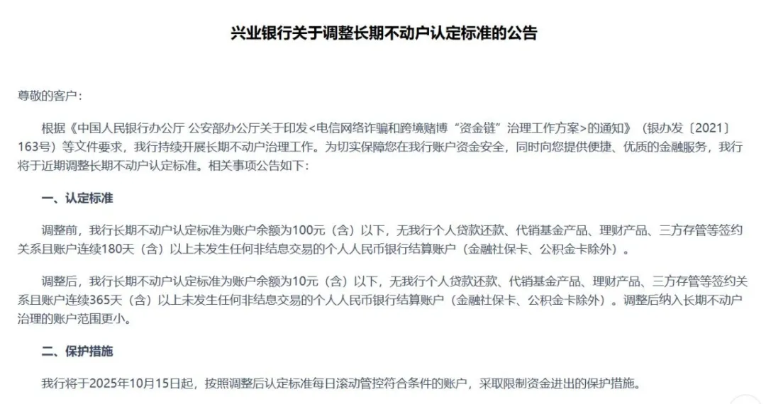 记者注意到,以兴业银行为例,10月15日起,该行将每日滚动管控符合条件的账户。新标准规定:账户余额10元以下,连续一年无交易,且未绑定贷款、理财或三方存管业务的个人结算账户,将被纳入管理范围。其中,社保卡、公积金卡除外。
