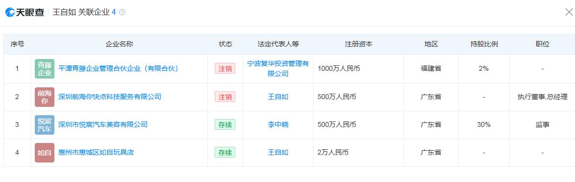 天眼查APP显示,王自如名下共关联4家公司,目前有2家公司已注销,深圳市悦宸汽车美容有限公司为存续状态,其持有30%股份并担任监事一职,另有惠州市惠城区如自玩具店为在业状态。天眼查APP显示,今年1月,因未依照《企业信息公示暂行条例》第八条规定的期限公示年度报告,深圳市悦宸汽车美容有限公司被列入经营异常名录。此前,该公司已多次经营异常。