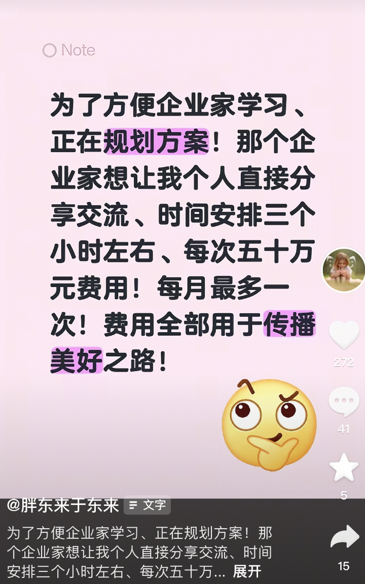 10月21日,于东来在社交账户发文称:“为了方便企业家学习,正在规划方案!哪个企业家想让我个人直接分享交流,时间安排三个小时左右,每次五十万元费用,每月最多一次!费用全部用于传播美好之路!”