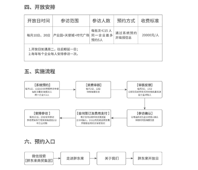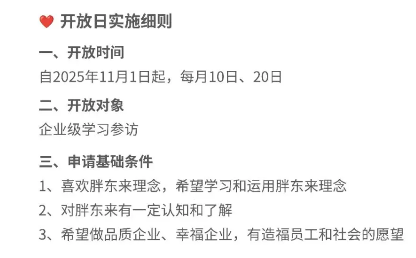 “胖东来开放日”实施细则显示,开放时间自2025年11月1日起,每月10日、20日,开放对象为企业级学习参观。参访范围为“产业园+天使城+时代广场”,申请基础条件中包括希望做品质企业、幸福企业,有造福员工和社会的愿望。参与人数每批次小于等于15人,同一企业最多预约五人,收费标准为一人2万元。每年每个企业每人安排参访一次。预约方式为通过系统预约并填报信息,胖东来方面将对报名企业进行资质审核。不过,目前的实施细则,并未透露更多详情,例如是否有机会与高管交流、时长多久等。