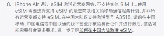 苹果表示,用户去运营商的线下营业厅之前,需要设置好iPhone Air。另外,包括国行iPhone Air(A3518)在内,国内eSIM机型最多可绑定2个eSIM号码,作为比较,海外机型可开通8张以上eSIM卡。