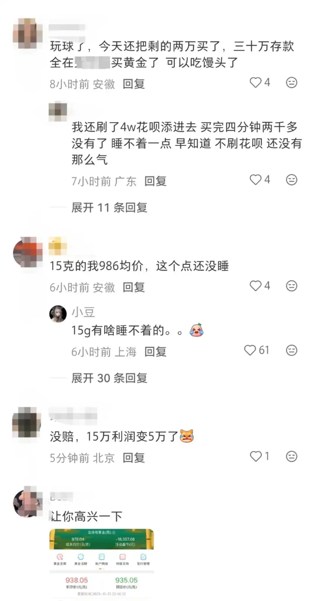 广东市民小陈则陷入更深的困境,前阵子听人说黄金能稳赚,他找朋友借了10万块,还刷了5万信用卡,想着赚了钱就还上,结果现在全被套住了。他透露,如今不仅要面对每日上涨的借贷利息,还要承受“本金可能亏损”的压力,“每天都睡不着觉,看着行情一点点往下走,真的很迷茫,不知道该怎么收场”。