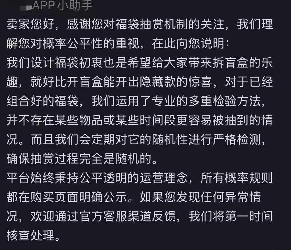 平台针对于女士反映的问题作出回应,但否认了概率不平衡导致“车主”频繁被“爆头”的情况。回应指出,平台运用了专业的多重检验方法,并不存在某些物品或某些时间段更容易被抽到的情况。