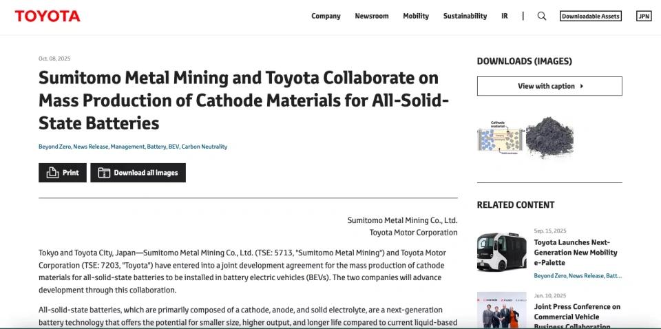 虽然中国新能源汽车相关产业链在国际上已经遥遥领先,但众多海外车企也在发力。丰田10月宣布与住友金属矿山合作开发的“高耐久性正极材料”突破量产瓶颈,全固态电池计划2027-2028年量产,能量密度450-500Wh/kg,初期搭载雷克萨斯高端车型,2030 年大规模普及。