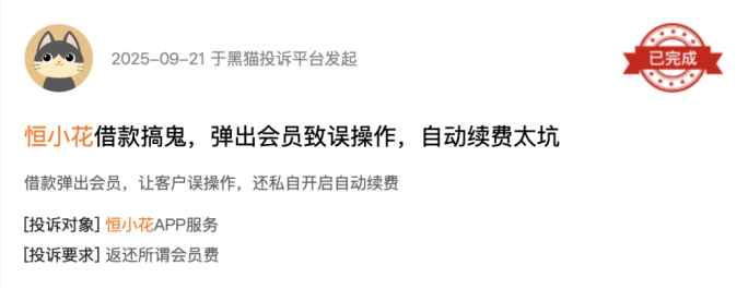 据黑猫投诉平台中消费者反馈,恒小花APP弹出的开通会员页面,容易使用户误触操作,甚至私自开启自动续费。