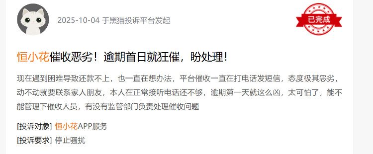 “恒小花”的催收方式也频频被投诉。据黑猫投诉平台显示,不少用户投诉其“信息骚扰和恐吓”“爆通讯录”等各种不合理的催收行为。一用户表示因遇困难导致还款逾期一天,频繁接到态度恶劣的催收电话和短信,甚至有用户称在还款日当天就受到“暴力催收”。
