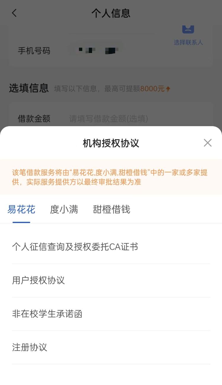 表面上看用户只需要签署5个协议,但点进协议中还有附属内容,包括将个人隐私信息授权给第三方的协议。比如在《机构授权协议》中包括“易花花”4项协议、“度小满”8项协议、“甜橙借钱”21项协议,合计共33项。其中并不只是这三个平台的相关协议,还包括其他机构平台的相关协议。