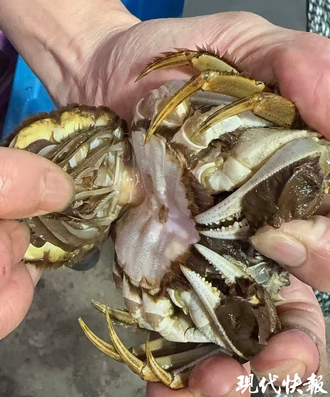 在市场水产交易区,许多经营户都把大闸蟹摆在了最显眼的位置,一只只青壳白肚的大闸蟹张牙舞爪,吸引不少市民驻足挑选、询价。某水产经营户拿起一只母蟹,展示其饱满的蟹黄。“农历九月的雌蟹黄膏丰腴,正是口感最佳的时候;而公蟹长得慢些,要到农历十月西北风起之后,脂肪才逐渐堆积起来,长成鲜美至极的蟹膏,届时将迎来另一波品蟹高峰。经营户表示,今年9月中上旬大闸蟹刚上市时,由于数量少、市场需求量大,价格偏高。但中秋国庆假期过后,大闸蟹大量上市,批发价格也有所回落。节后卖得最好的是2.5两的母蟹和3.5两的公蟹,性价比最高,大闸蟹的个头不错,肉质也饱满。”该经营户说。