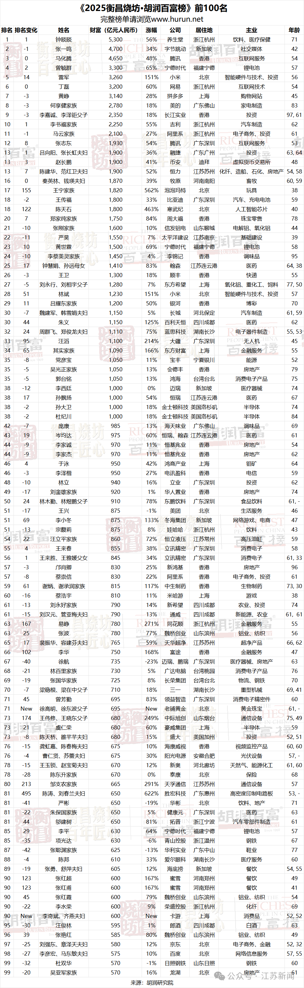 2025胡润百富榜前100名榜单如下: