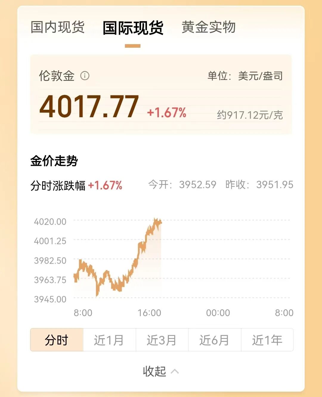 截至17:45,报4017.77美元/盎司,涨1.67%。
