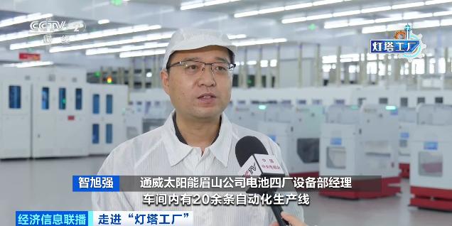通威太阳能眉山公司电池四厂设备部经理 智旭强:车间内有20余条自动化生产线,在数字化转型后,日产量从2024年的441万片,提升至目前的495万片,净增54万片每天。