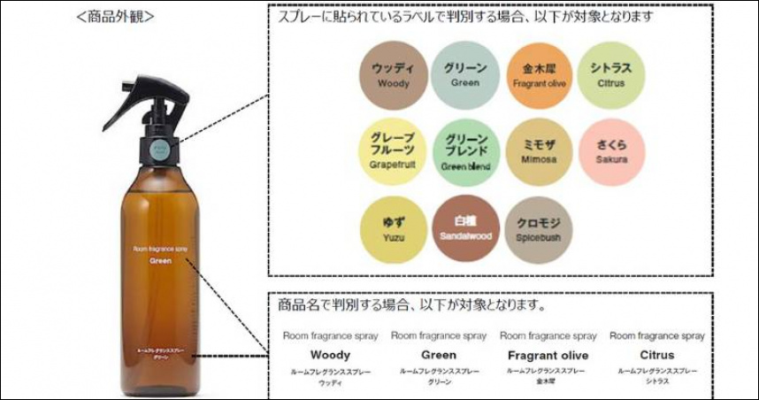 据共同社报道,根据母公司良品计划说明,这次回收的产品包括Woody、Green、桂花、柑橘、葡萄柚、含羞草、樱花、柚子、檀香和乌樟等11种特定香味。