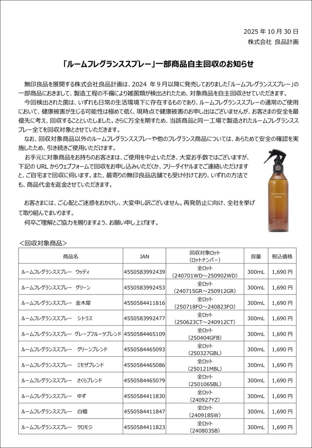 近日,日本人气品牌MUJI爆出产品安全危机,旗下热卖的室内香氛喷雾惊传在生产过程中遭细菌污染,母公司紧急宣布回收多达60万瓶产品。事件涉及2024年9月后上市的11种味道,包括Woody及Green等经典香味。